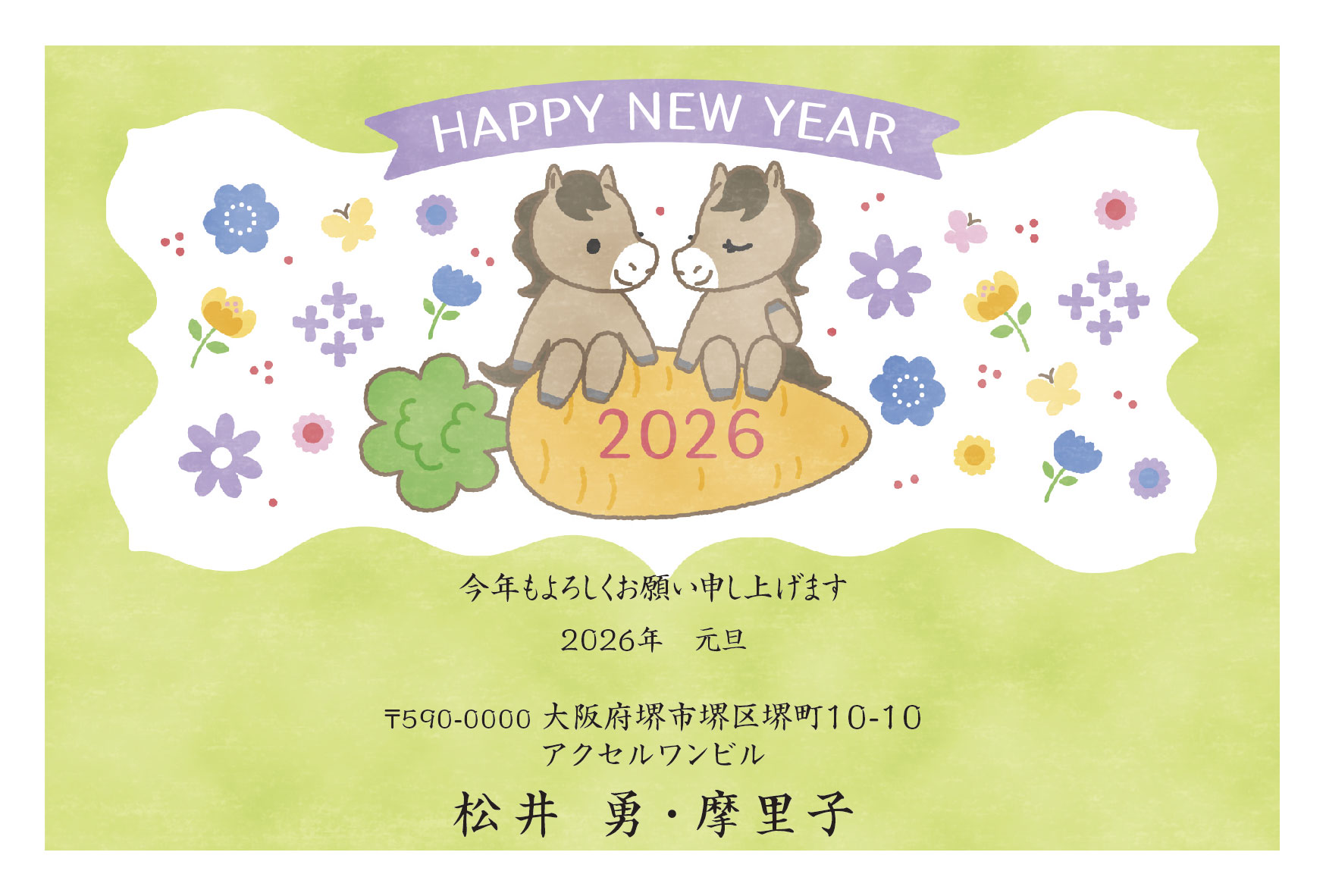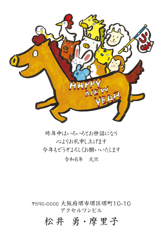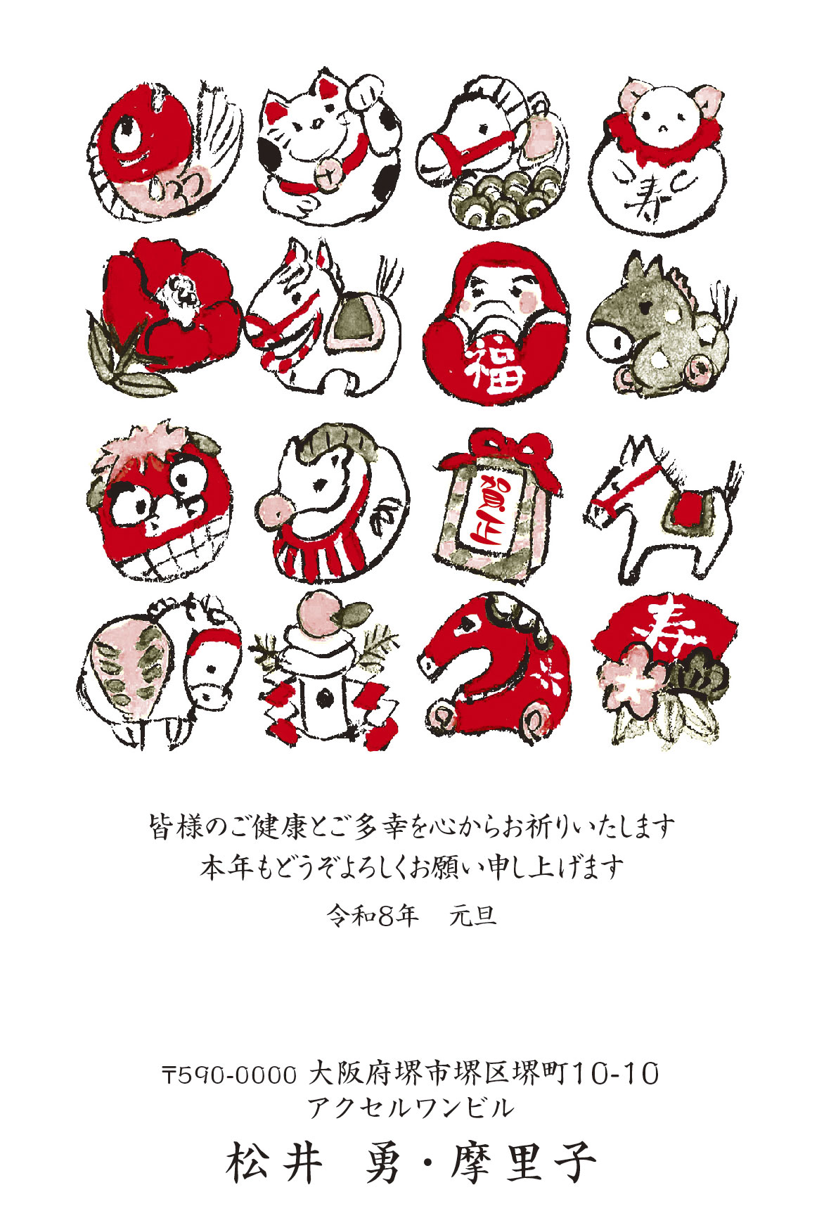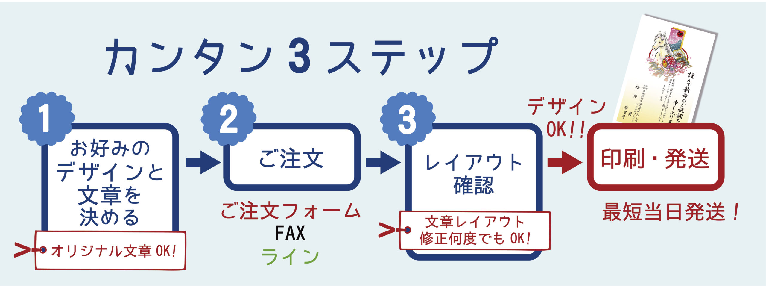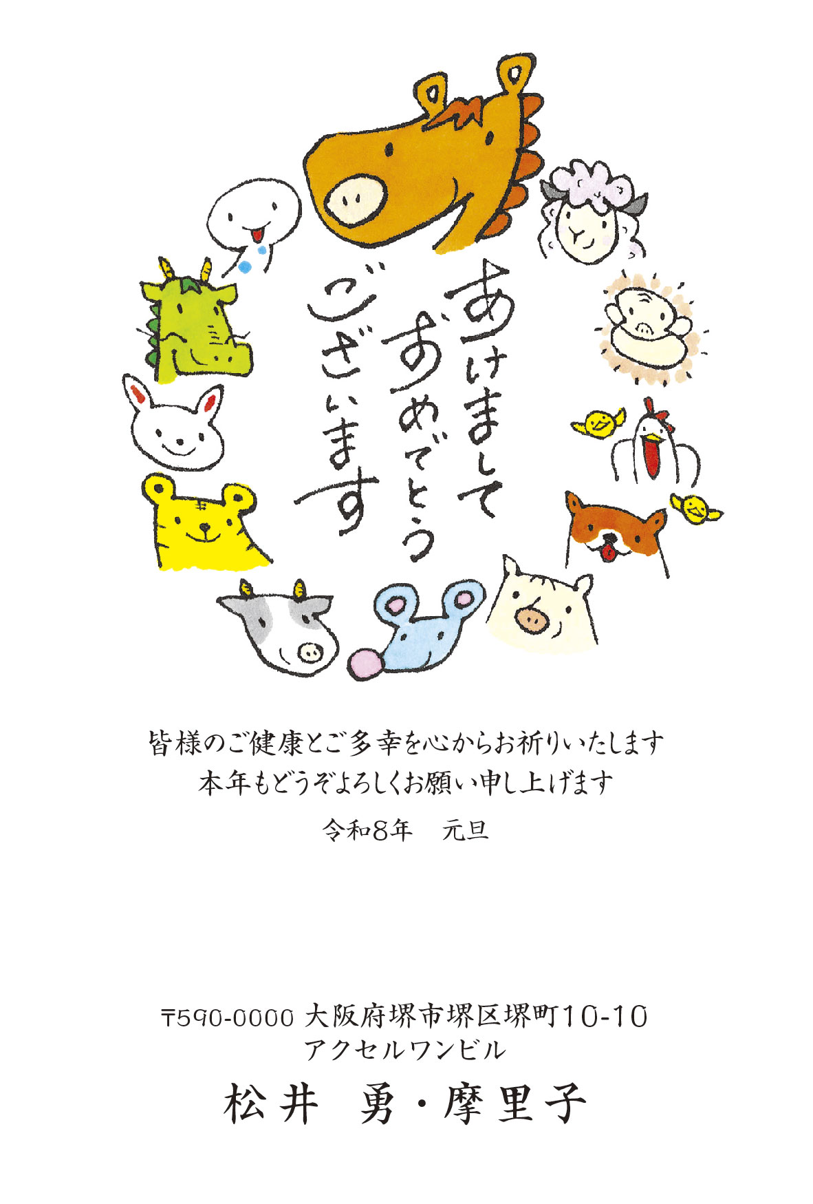 年賀状デザインをお選びください。デザイン番号を選んで、ご注文にお進みください。文章は自由にご記入いただけます。